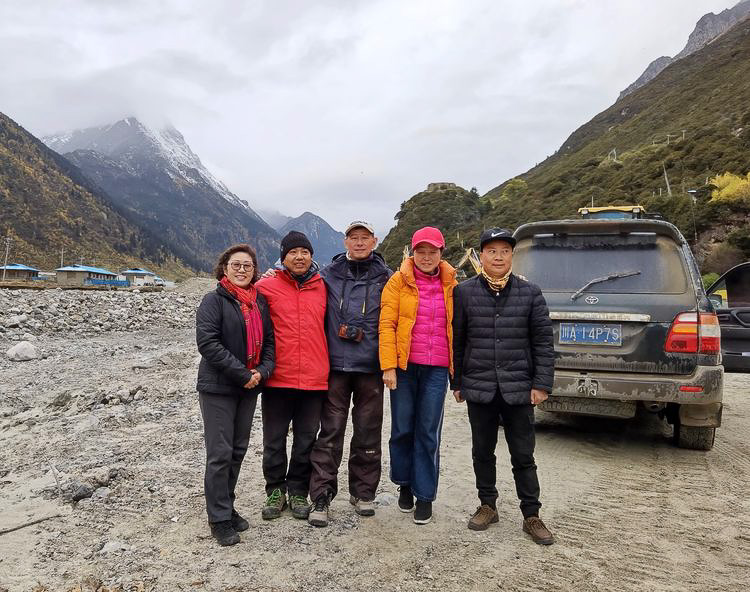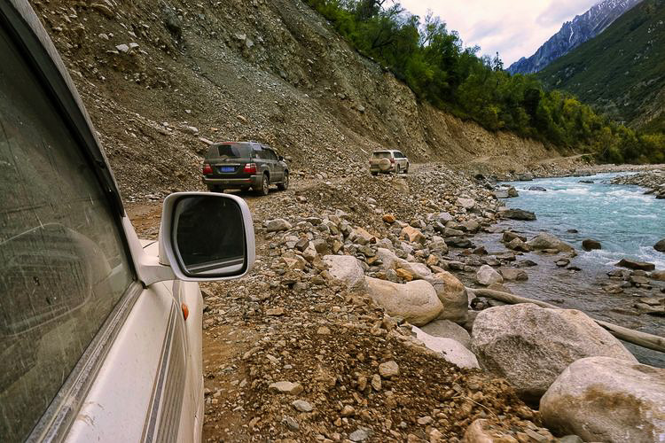 下午两点多从乡政府所在地尼屋乡出发,沿易贡藏布的一条支流玛拉藏布(依嘎峡谷)计划抵依嘎冰川。依嘎峡谷一共有十四个村落,从下流往上依次叫忠义乡(尼屋乡)一至十四村,十四村就位于依嘎冰川的脚下。据说这里冰洞、冰瀑、冰塔林应有尽有,目前属于极少有人光顾的秘境。但是,由于今年六月该河谷遭暴雨洪水冲击,道路全线严重毁损,几乎看不出路的原型,绝大部分时间车辆行驶在河床简易路面。当车队行驶到忠义十一村时约40公里的路程已经费时近三个小时。此时,前方河谷里的道路全部中断,经想尽一切办法仍无法通行。经商议无奈原路返回尼屋乡,遗憾的放弃了依嘎冰川拍摄计划。为了记住这难得的经历,小李老师提议,我们同车五人就把身影定格在了忠义十一村的河谷中。