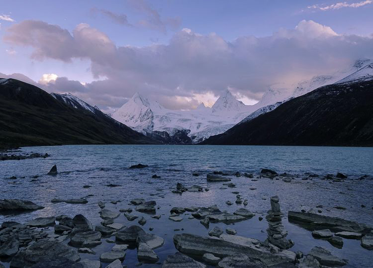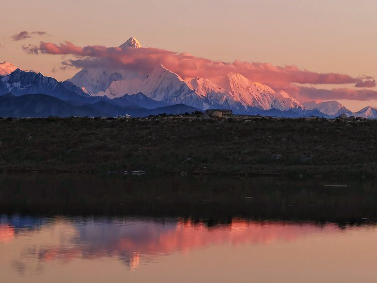 早晨成都还阴雨绵绵,过了康定天就蓝了,那跑马溜溜的山上有一朵溜溜的云,心情也爽爽起来。傍晚路过康定机场旁的斯丁措(海拔4199米)竟拍到了贡嘎山(四川省最高的山峰,主峰海拔7 556米)日落迷人的倒影。虽没有机会欣赏到“蜀山之后”四姑娘山的美貌,却意外领略到了“蜀山之王”的雄姿,也算是苍天对改道的一种补偿吧。