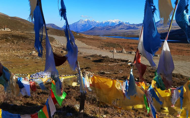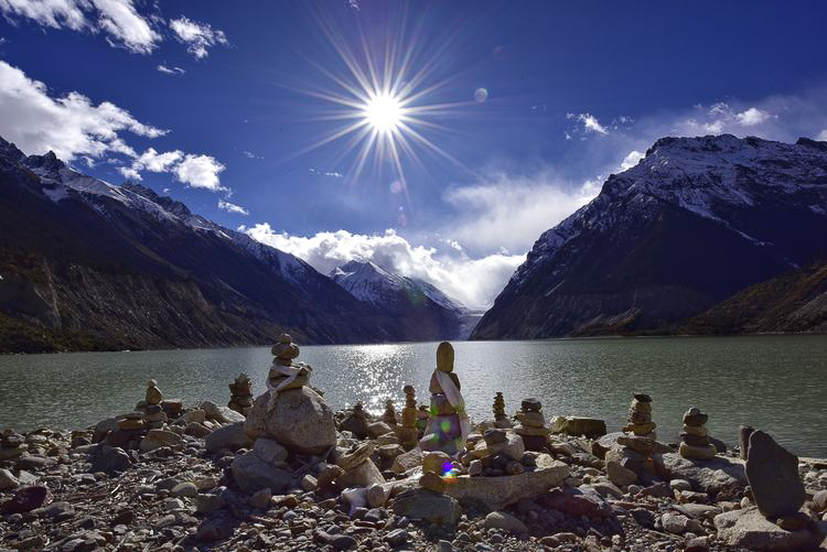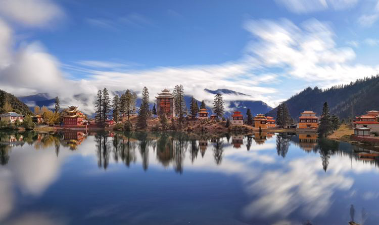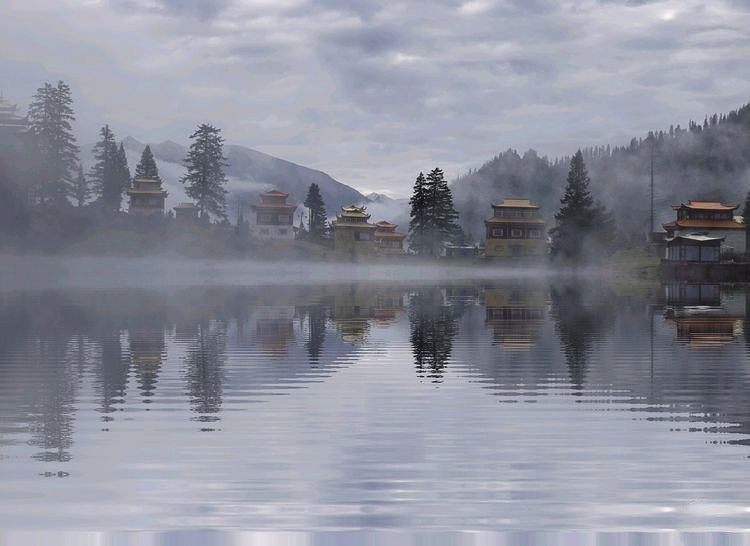 清晨的措卡湖格外迷人,湖的四周白雾弥漫,湖面还有一层轻紗般的薄雾。随着太阳的升起,白雾就像一帘大幕缓缓拉开,露出来了若影若现的雪山,金色的佛塔和寺庙倒映在湖中,感觉是那么灵气而又庄严神圣。措卡湖四周的村寨大概是沾了措卡湖的灵气,这片群峰簇拥的田园犹如世外桃源、仙居一般……