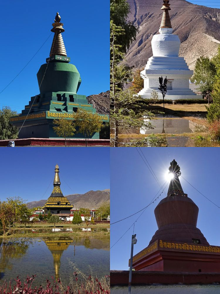 途经山南市泽当镇,远远的遥拍到扎西次日山上的古堡式建筑——雍布拉康,它是西藏历史上第一座宫殿,也曾是文成公主的行宫。下午参观了山南乃东县泽丹镇的桑耶寺,这是西藏莲花生建立的第一座寺庙。与其他寺庙不同的是,在主殿乌孜大殿成直线的四个方位分别建有白、红、黑、绿四座佛塔。我猜想应该是代表某方势力或是象征四大天王,镇伏凶神邪魔,保佑信徒们吧……