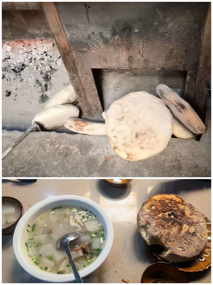 锅边烤青稞馍馍,还有牛肉汤