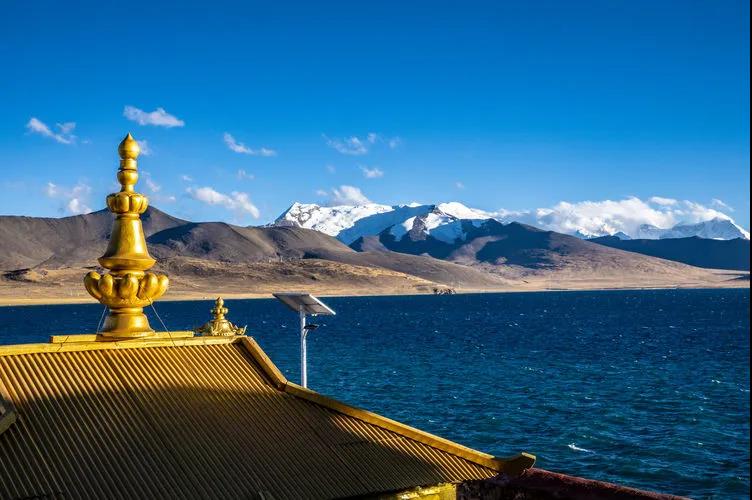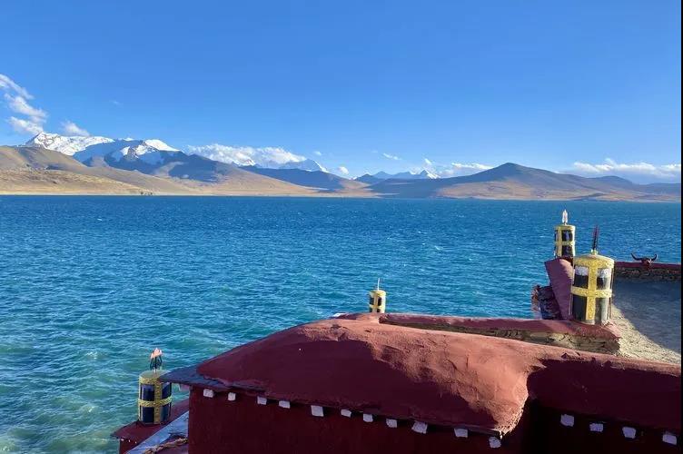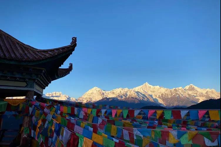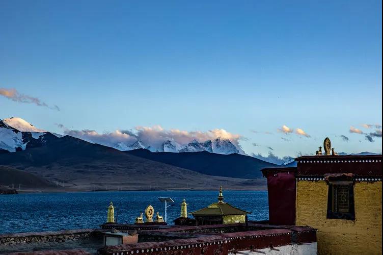 夕阳下,站在寺庙上远远望去,雪山、湖水与寺庙构成的美妙的画面,令人难忘。