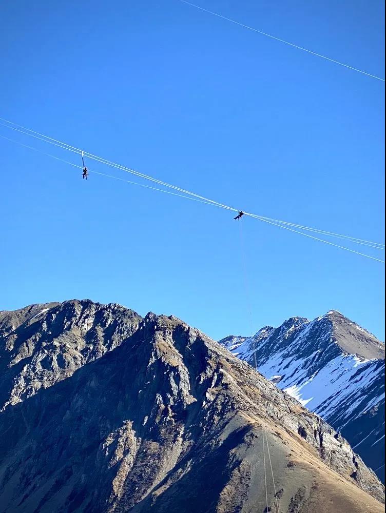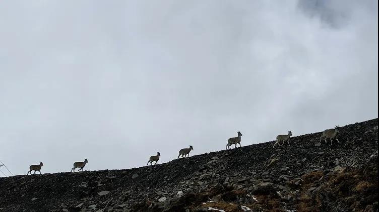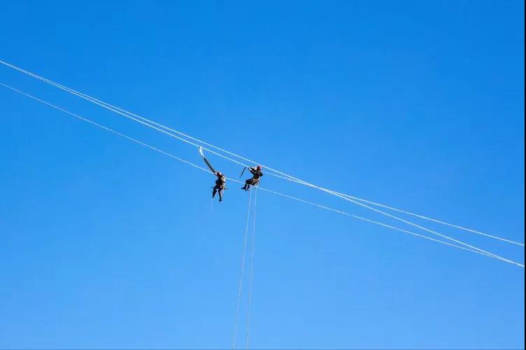 海拔4500米的路上,见到电力工人在空中随风飘荡,他们在为输电线路安装防风偏、防舞动的绝缘间隔棒,为他们点赞。