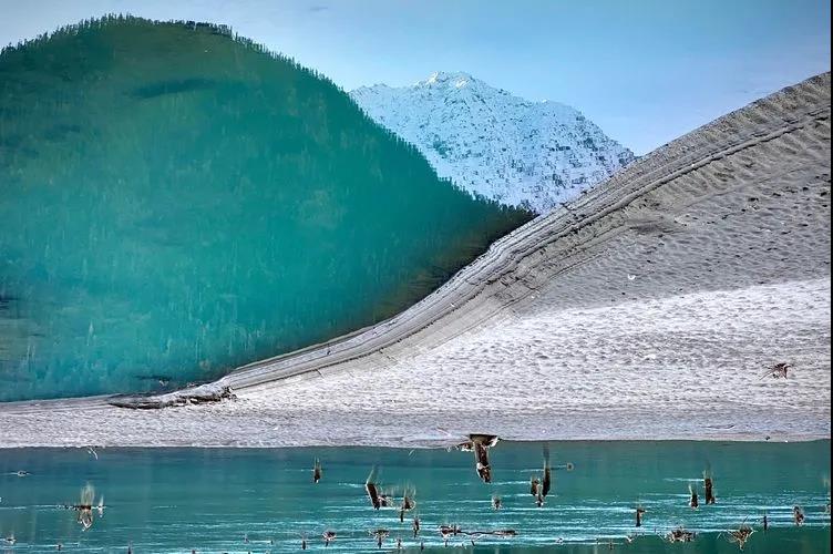 中国与不丹边境上的普姆雍措,海拔5010米,被一座座银色雪峰所环绕。
