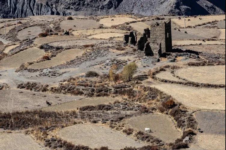 周围散落着众多古碉,或在山间、或在地头、或在峭壁、或在峡谷。