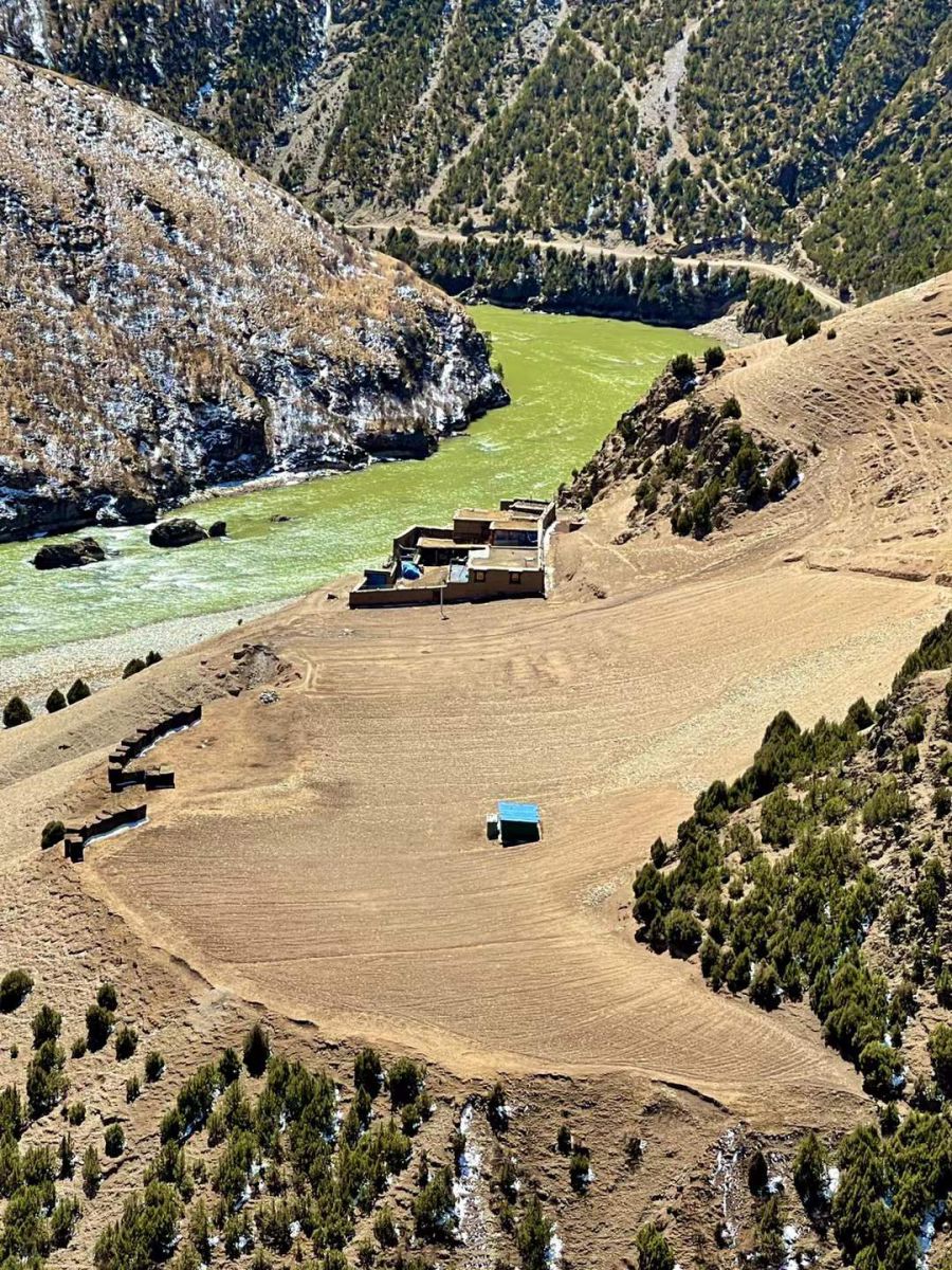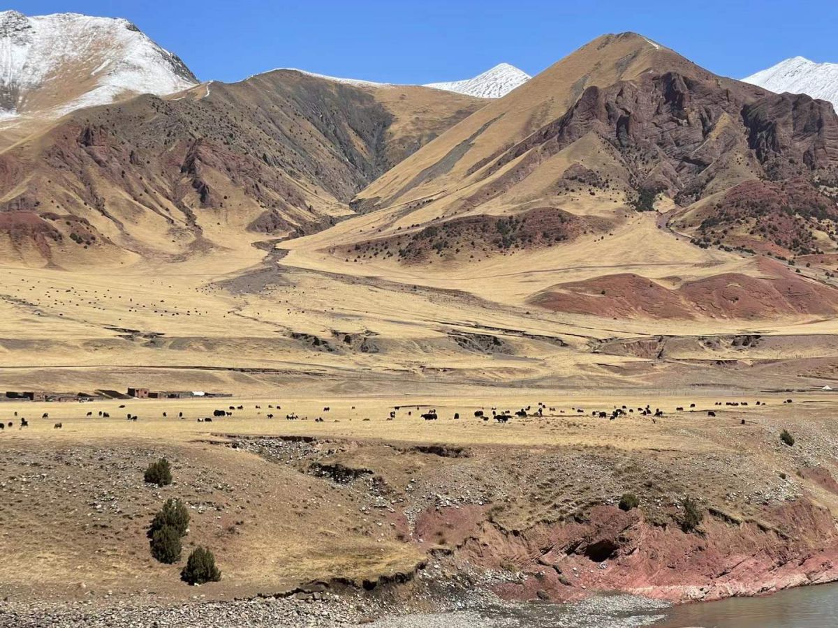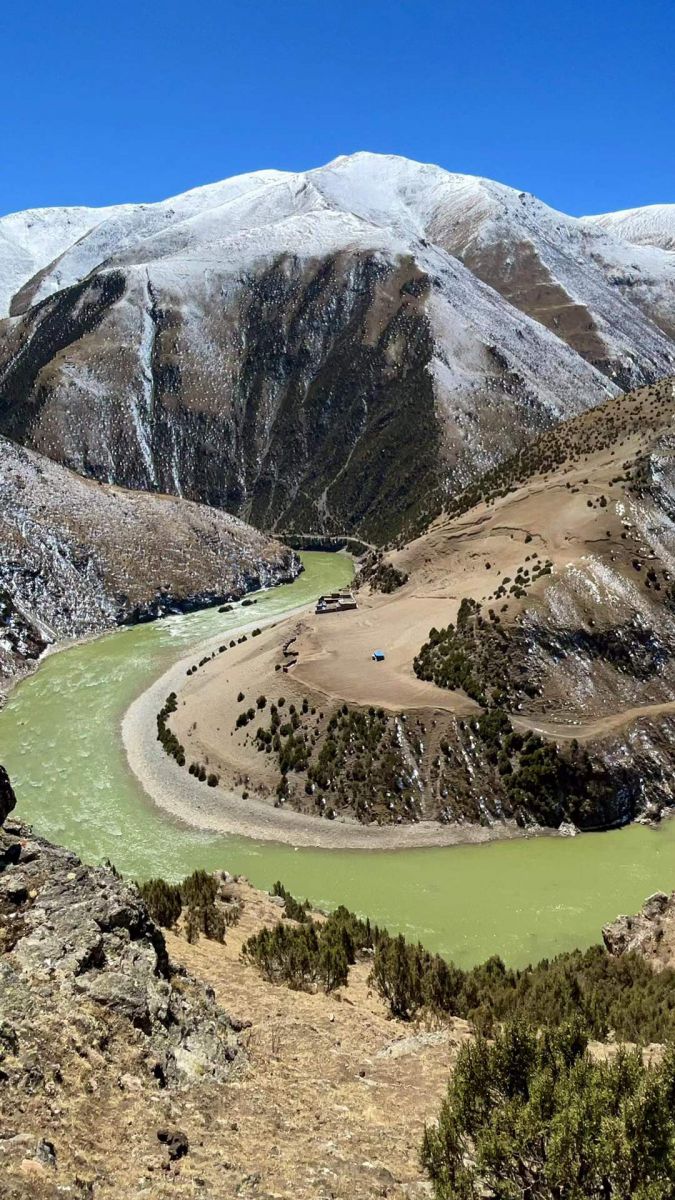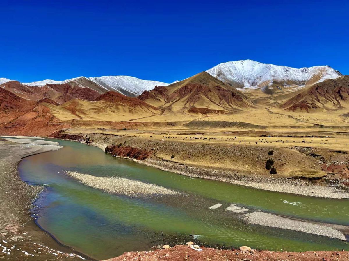 去比如县萨普神山的路上,有这么一座山,本身是黄色和红色为主,身后是一座雪山做陪衬,山脚下有一条河绕其而过。本来是来看萨普神山的,还没到神山,比如县的两处美景已经让人震撼了!