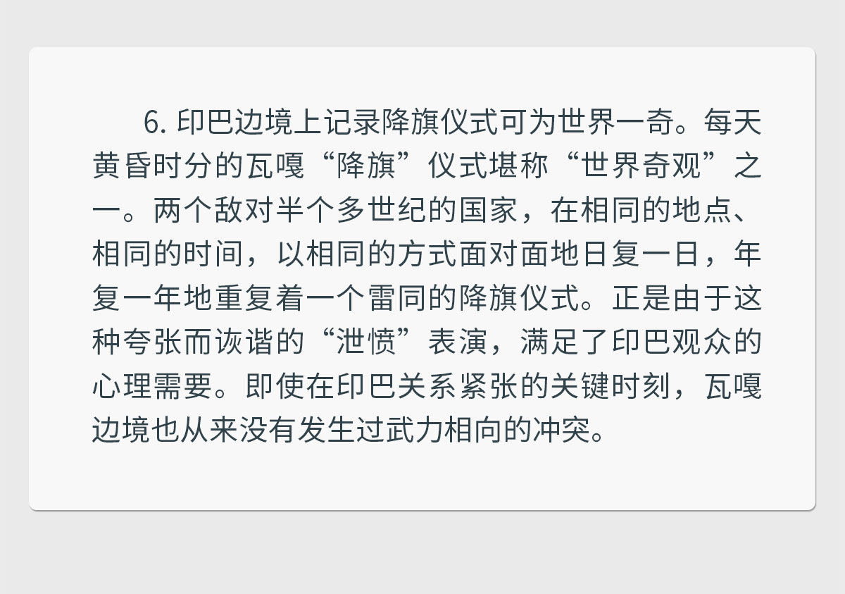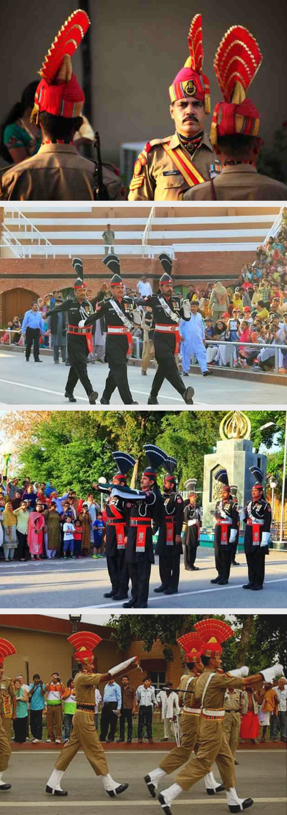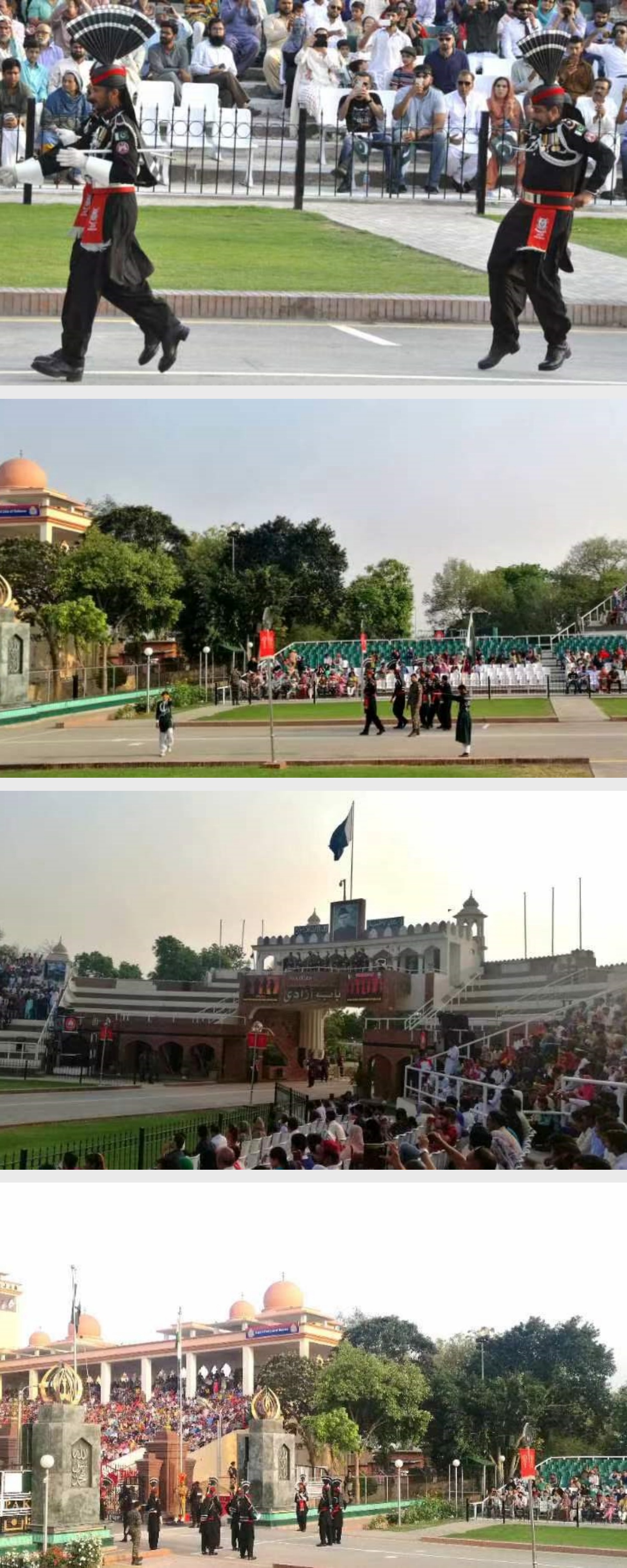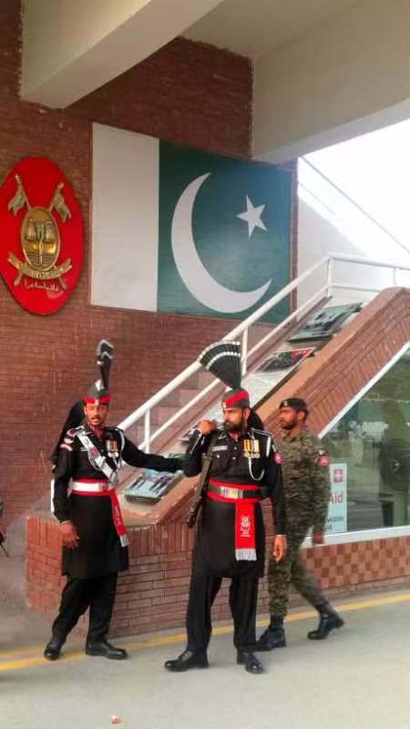 下午的巴基斯坦独立塔是巴基斯坦独立的象征。之后前往印巴边境上记录降旗仪式,这可为世界一奇。每天黄昏时分的瓦嘎“降旗”仪式堪称“世界奇观”之一。两个敌对半个多世纪的国家,在相同的地点、相同的时间,以相同的方式面对面地日复一日,年复一年地重复着一个雷同的降旗仪式。正是由于这种夸张而诙谐的“泄愤”表演,满足了印巴观众的心理需要。即使在印巴关系紧张的关键时刻,瓦嘎边境也从来没有发生过武力相向的冲突。