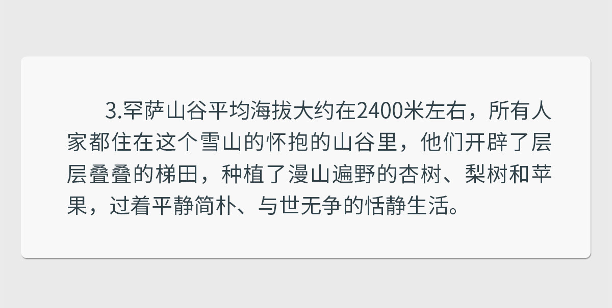 早餐后,前往当地村庄拍摄自由拍摄,可造访当地集市、村庄、小工艺品市场。罕萨山谷平均海拔大约在2400米左右,所有人家都住在这个雪山的怀抱的山谷里,他们开辟了层层叠叠的梯田,种植了漫山遍野的杏树、梨树和苹果,过着平静简朴、与世无争的恬静生活。