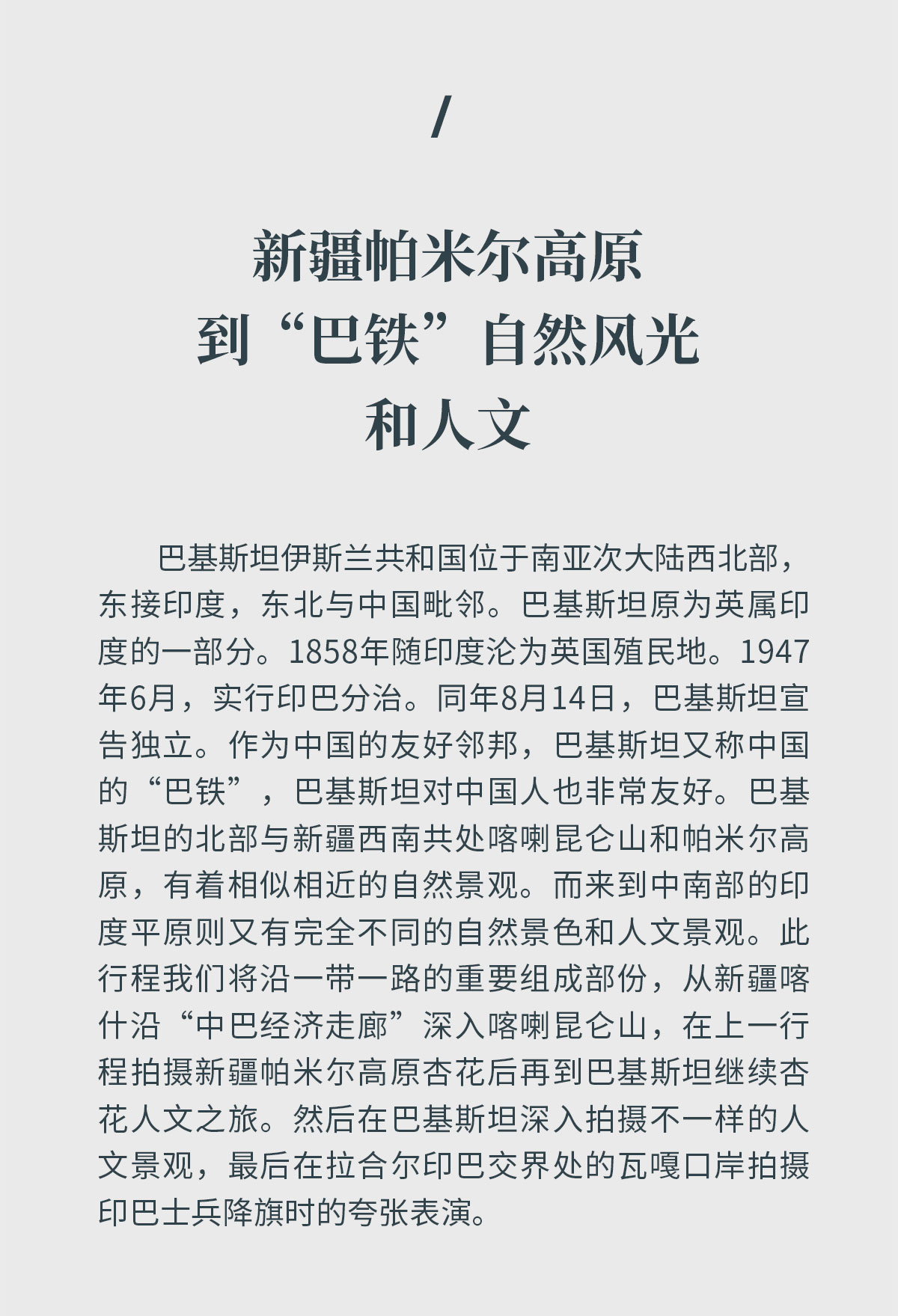 巴基斯坦伊斯兰共和国位于南亚次大陆西北部,东接印度,东北与中国毗邻。巴基斯坦原为英属印度的一部分。1858年随印度沦为英国殖民地。1947年6月,实行印巴分治。同年8月14日,巴基斯坦宣告独立。作为中国的友好邻邦,巴基斯坦又称中国的“巴铁”,巴基斯坦对中国人也非常友好。巴基斯坦的北部与新疆西南共处喀喇昆仑山和帕米尔高原,有着相似相近的自然景观。而来到中南部的印度平原则又有完全不同的自然景色和人文景观。此行程我们将沿一带一路的重要组成部份,从新疆喀什沿“中巴经济走廊”深入喀喇昆仑山,在上一行程拍摄新疆帕米尔高原杏花后再到巴基斯坦继续杏花人文之旅。然后在巴基斯坦深入拍摄不一样的人文景观,最后在拉合尔印巴交界处的瓦嘎口岸拍摄印巴士兵降旗时的夸张表演。