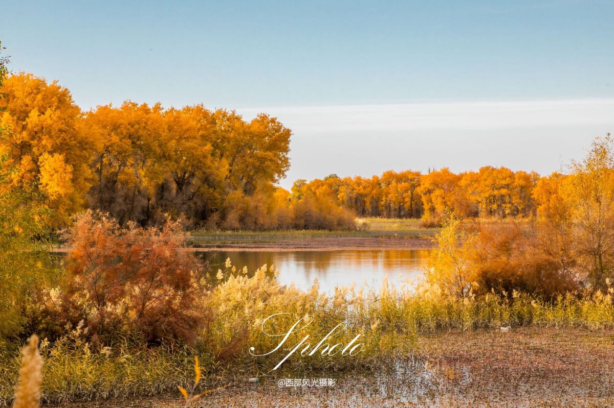 6.草湖是一个塔里木河畔的原生态牧业村,沙丘、胡杨林和蓝色的河道、水洼构成世间最美画面。此时正值塔里木辉煌的季节,那金黄色的、金红色的、金棕色的、金紫色的胡杨与湛蓝的天空竞相辉映,奏响了生命之魂的赞歌。