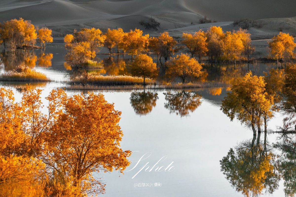 10. 塔里木盆地边缘沙漠中的水中胡杨林,这是又一个原始的水上胡杨林景区,湖水、沙漠、胡杨构成一幅幅美轮美奂的画面。