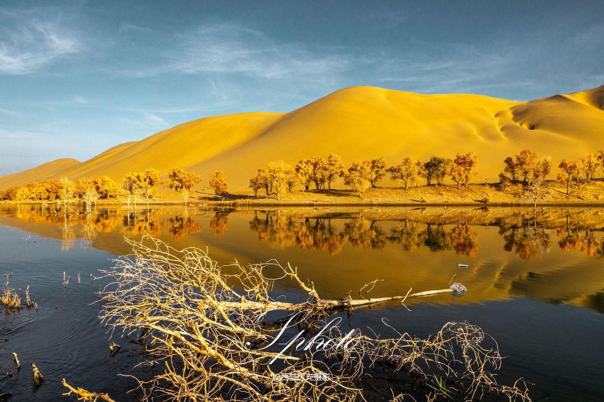 8.罗布湖位于塔里木盆地中的塔里木河畔,随着近二十年的生态调水,塔里木河水位随之抬升并蔓延至河床西岸低海拔的塔克拉玛干沙漠中,俯瞰大地,形成了一串以干流为“藤”、胡泊为“瓜”的湿地景观。其中罗布湖就是其中一景,纯净的沙丘、金色的胡杨、湛蓝的湖水,像一颗蓝宝石镶嵌在瀚海之中,吸引了众多旅游摄影人涉足探访,一睹她那神秘的魅影。