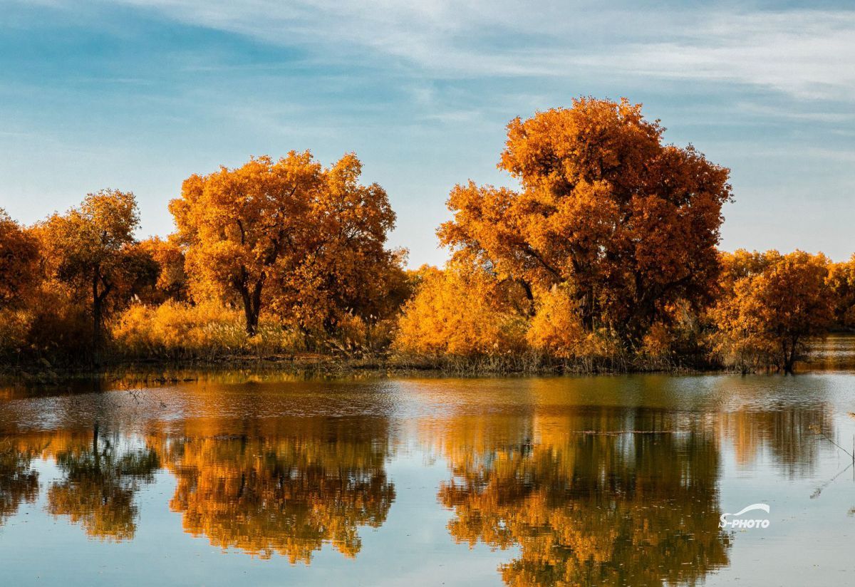 清晨离开乌恰前往塔里木盆地的巴楚,拍摄巴楚水中胡杨林。这里一片生长于叶儿羌河河杈的胡杨林,金黄的胡杨林与蓝天、碧水构成优美画面。之后前往阿拉尔市,沿途均是叶儿羌河畔的胡杨林。