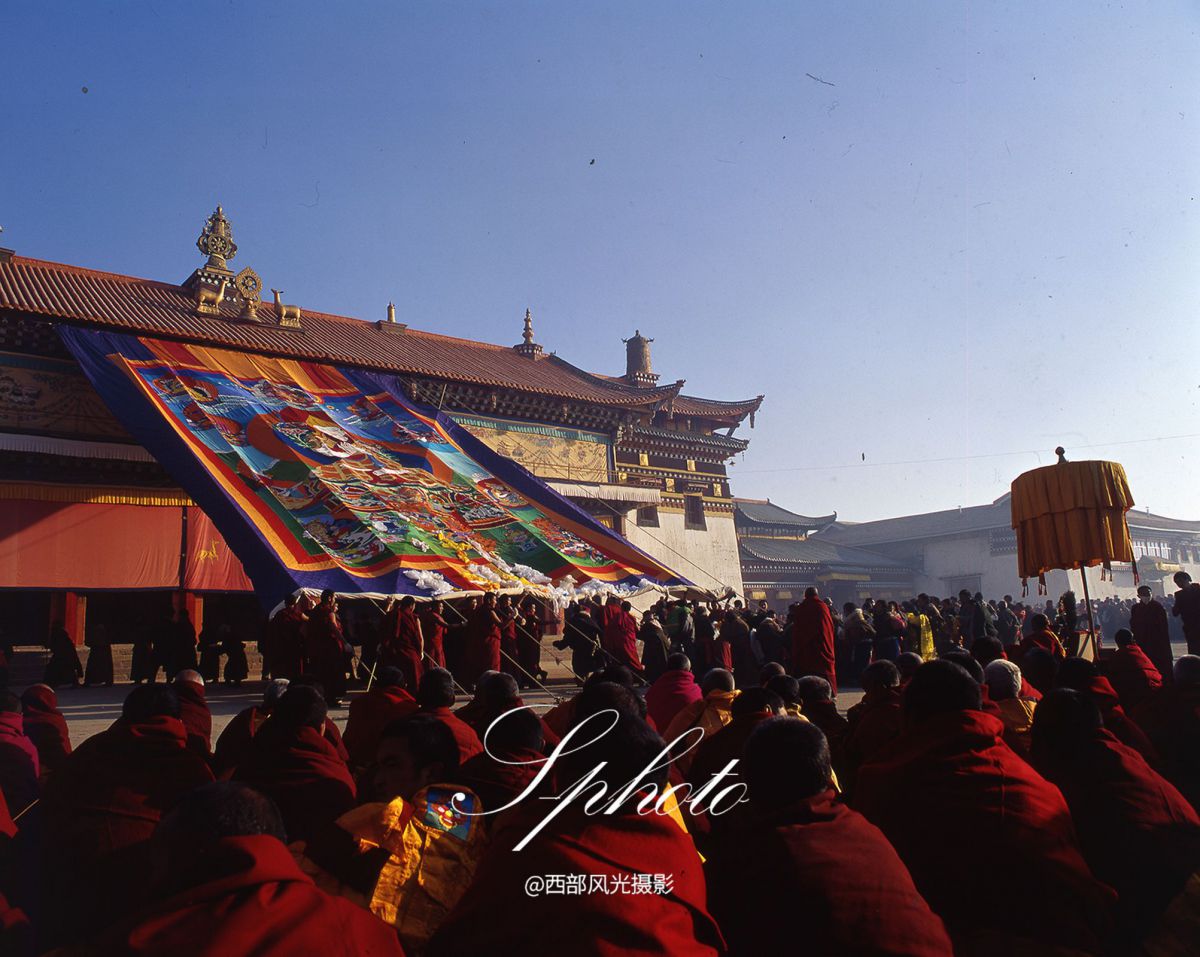 正月十三的郎木寺晒佛节,是藏传佛教格鲁派(黄教)一年一度的重要宗教盛典,也是甘南藏区最具代表性的传统节日之一。清晨,伴随着低沉悠远的法号、海螺与鼓钹齐鸣,数百名僧侣身着绛红色僧袍,在寺院山坡上列队而行。他们合力将一幅巨大的唐卡佛像(通常为释迦牟尼佛或弥勒佛)从佛殿中请出,缓缓展开于特制的晒佛台——一幅数十米高的巨幅织绣唐卡在朝阳下熠熠生辉,庄严神圣。信众们纷纷跪拜、献哈达、转经祈福,场面震撼人心。