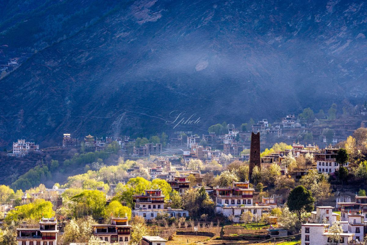 清晨拍摄贡嘎雪山日出后,下山驱车前往丹巴中路藏寨,拍摄藏寨日落