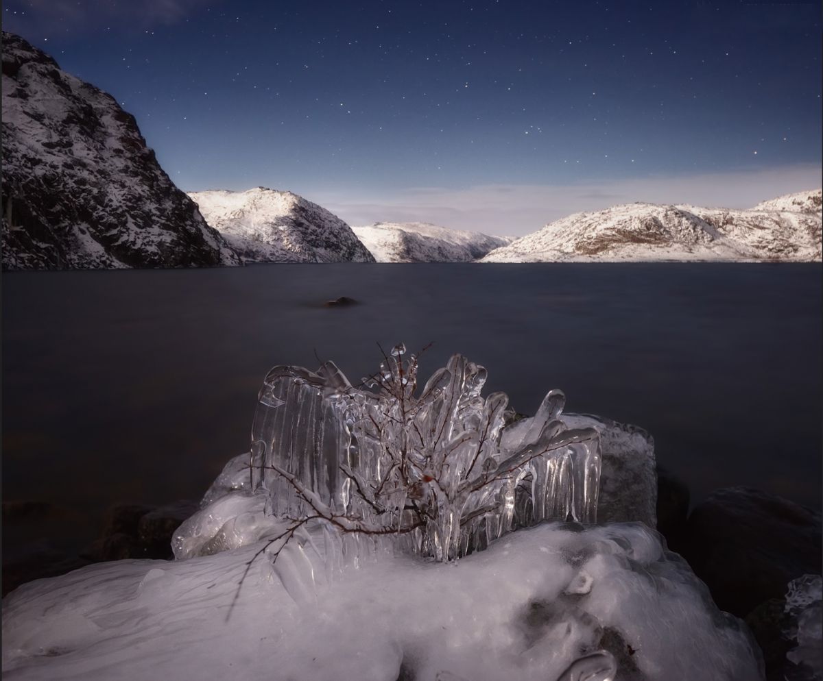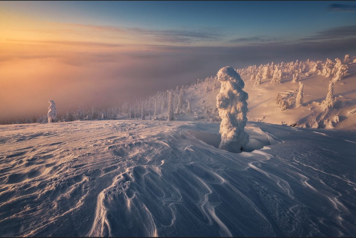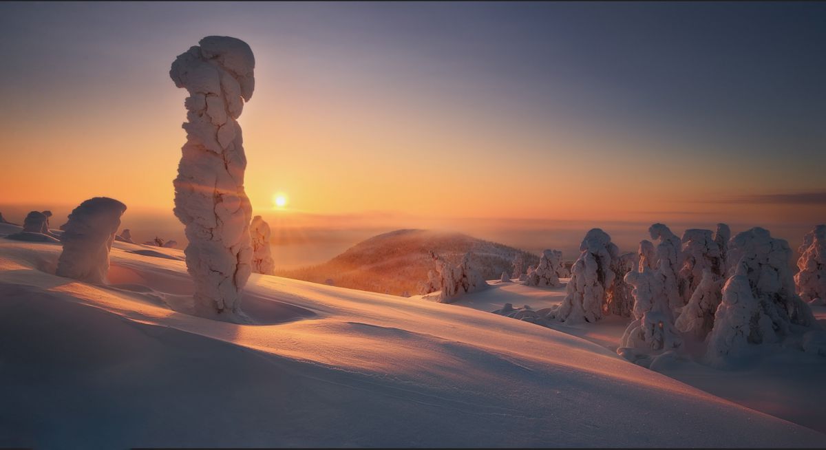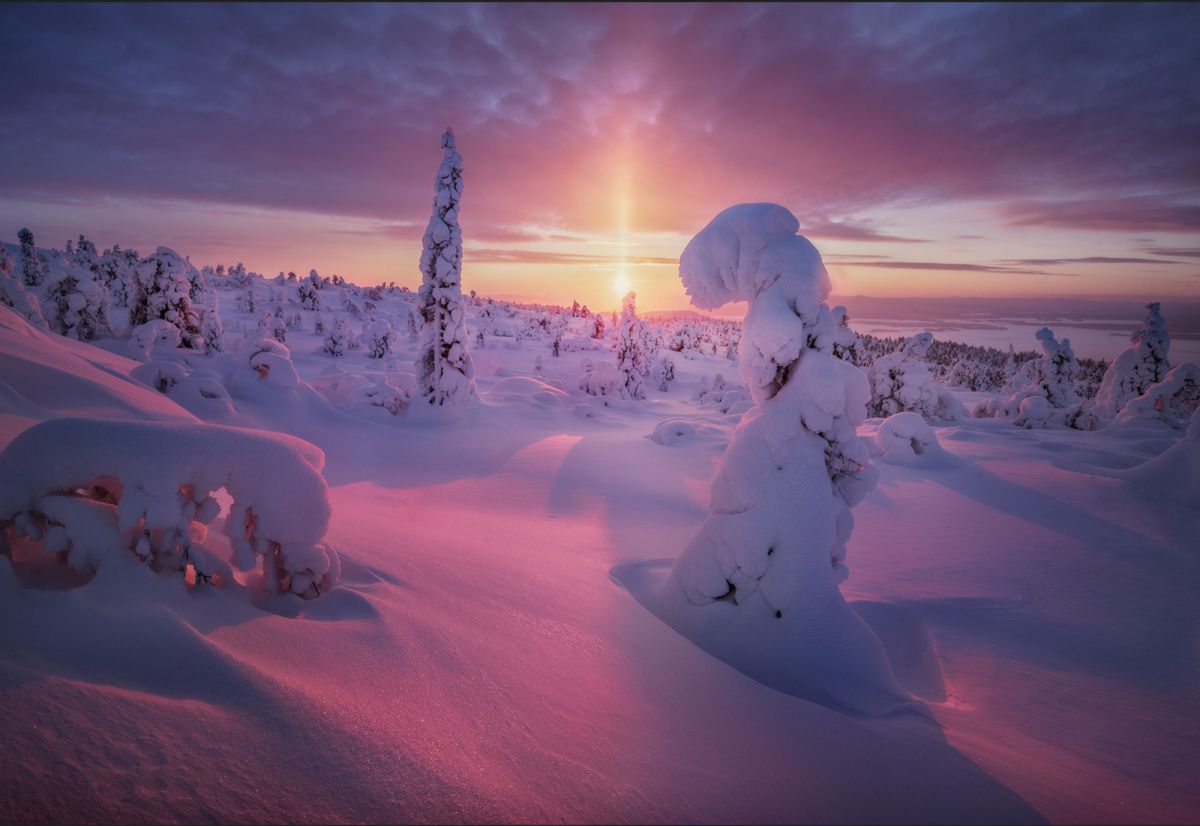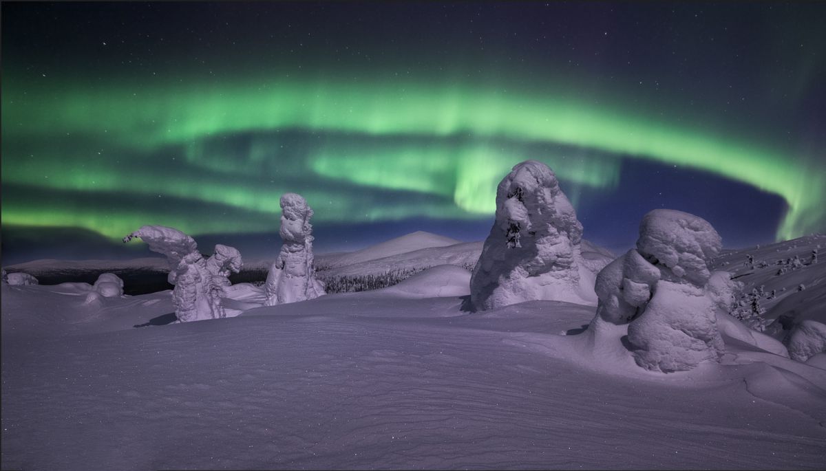 由于高纬度冬季白昼极短,这里一整天都是低角度阳光,拍完日出不久,随即拍摄日落,而漫漫长夜又是极光的天下。白海地区海岸线,登山顶以雪树掛为前景,拍摄极光