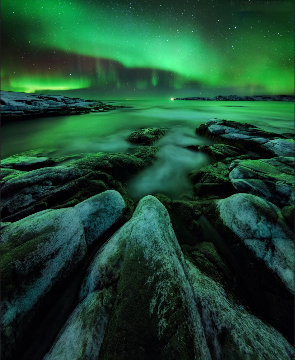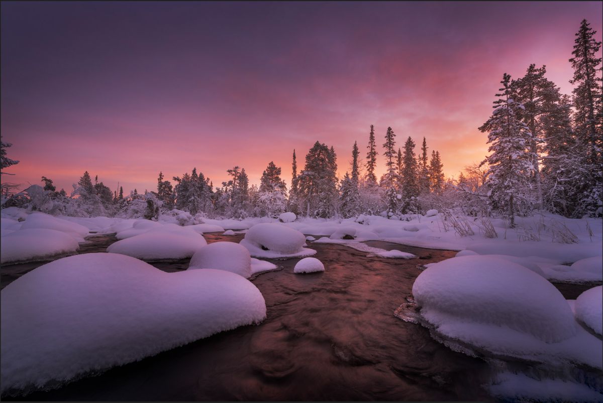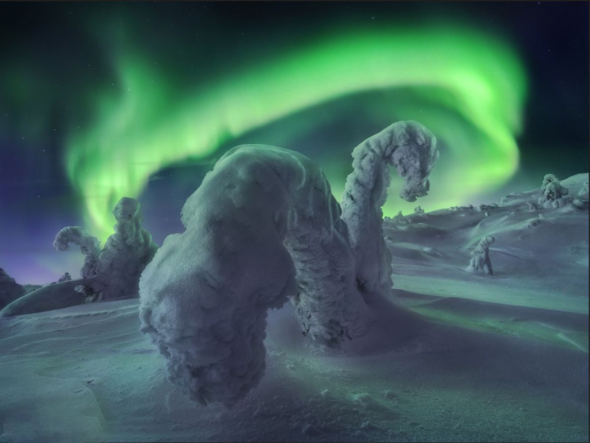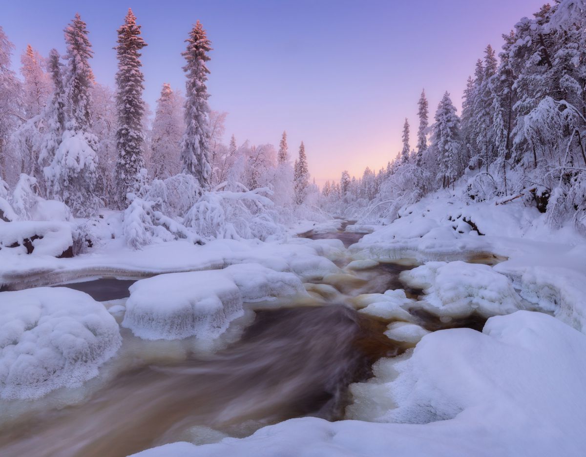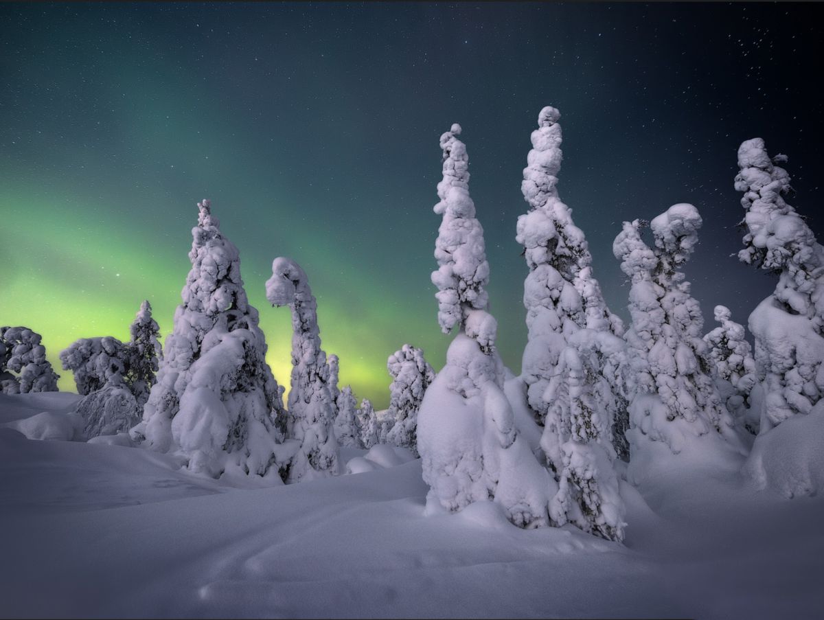 由于高纬度冬季白昼极短,这里一整天都是低角度阳光,拍完日出不久,随即拍摄日落,而漫漫长夜又是极光的天下。白海地区海岸线,登山顶以雪树掛为前景,拍摄极光