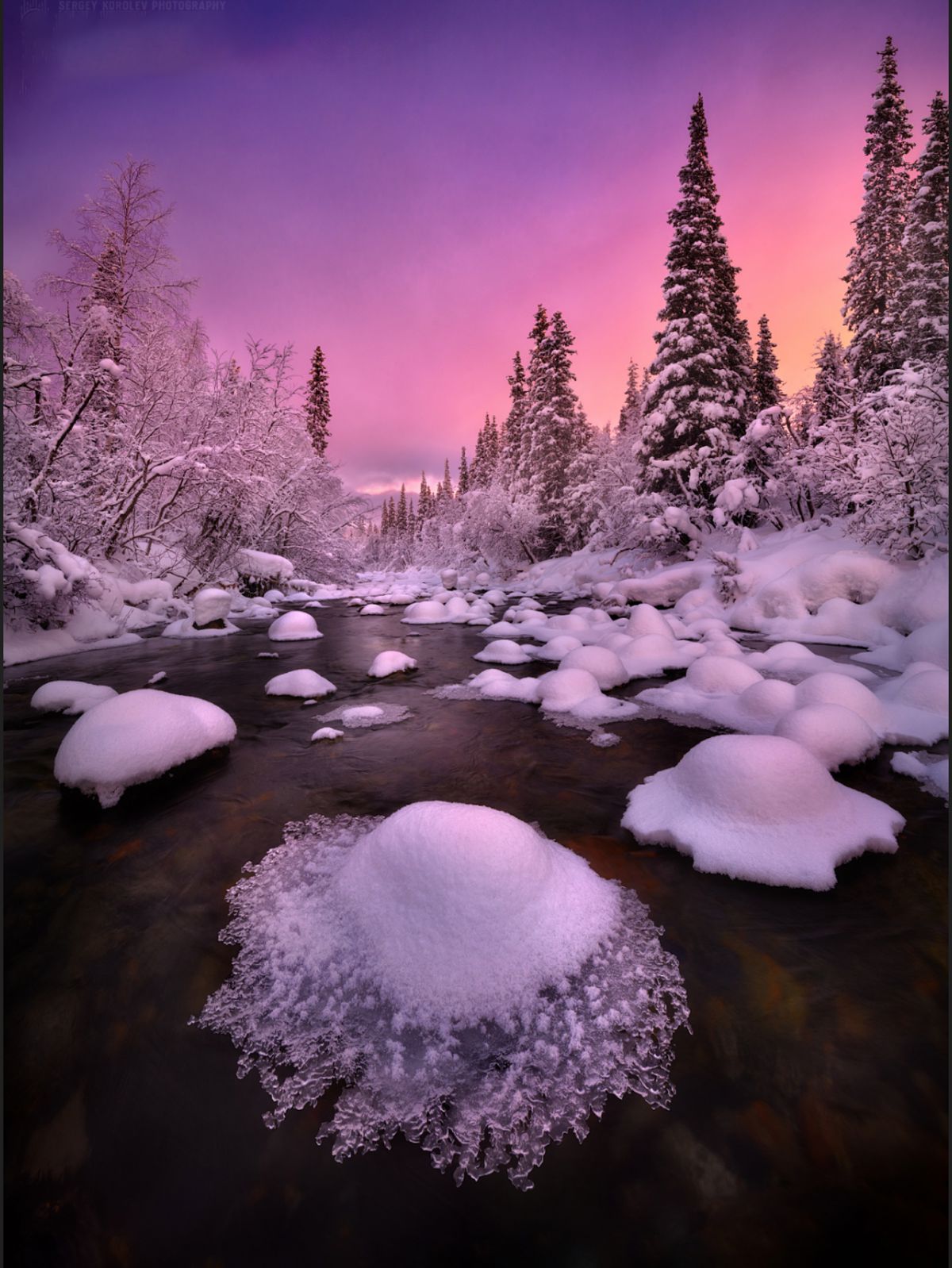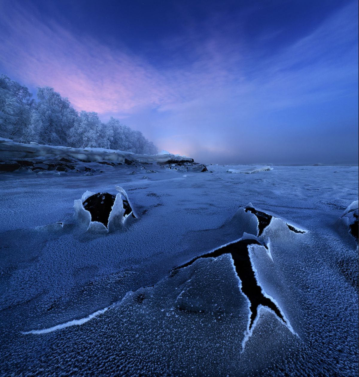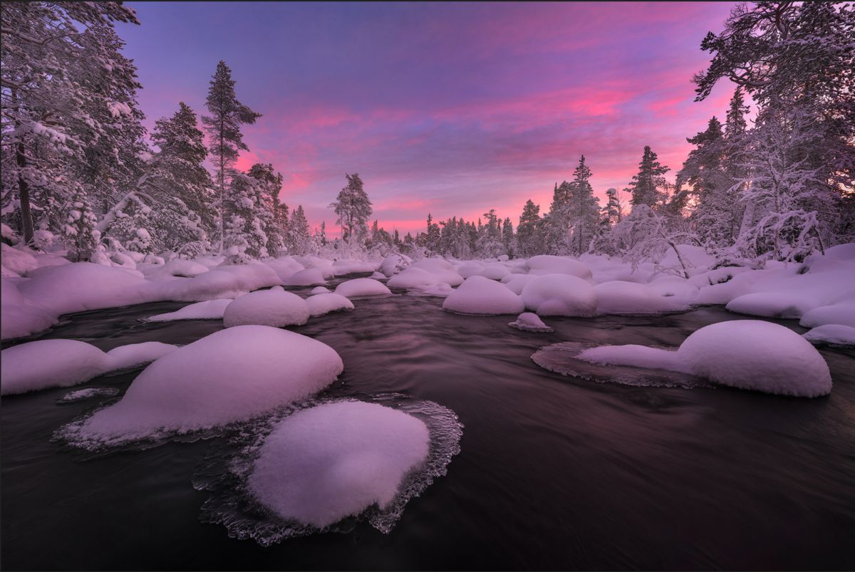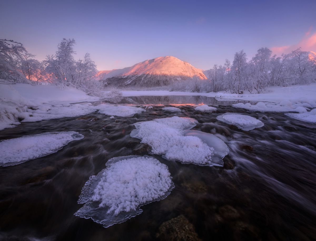 由于高纬度冬季白昼极短,这里一整天都是低角度阳光,拍完日出不久,随即拍摄日落,而漫漫长夜又是极光的天下。白海地区海岸线,登山顶以雪树掛为前景,拍摄极光