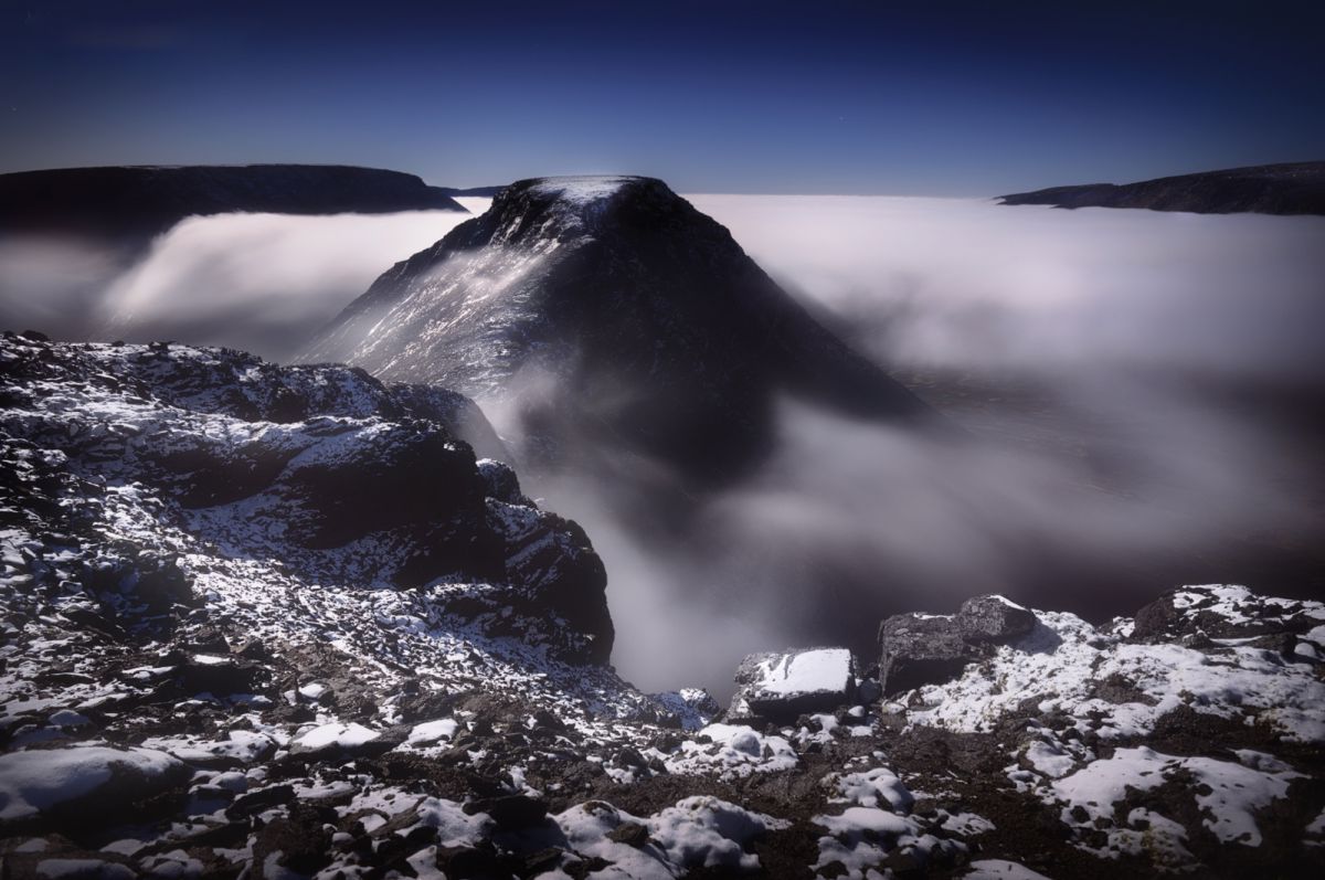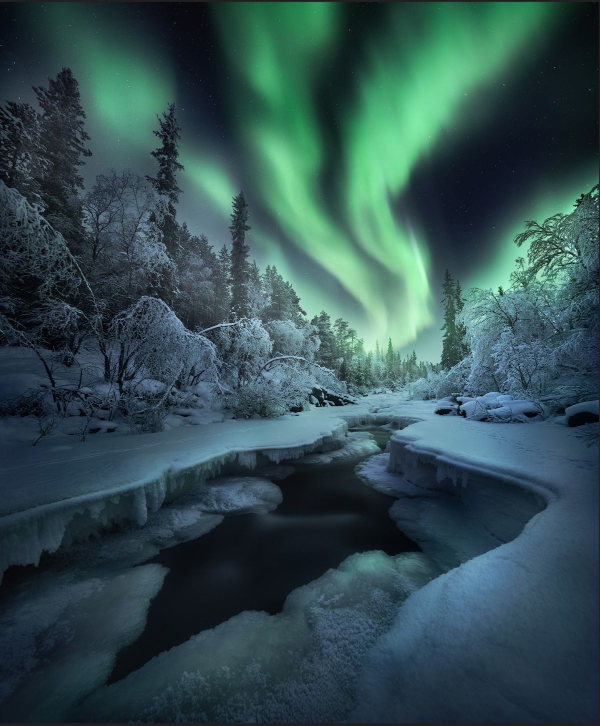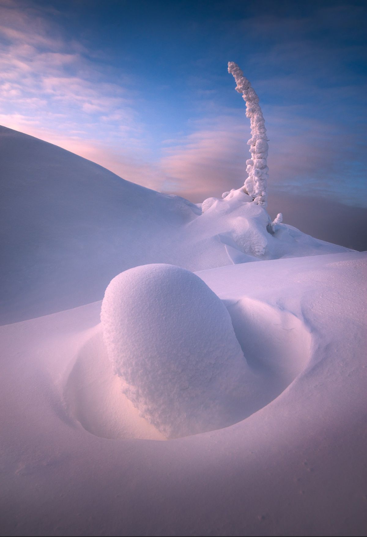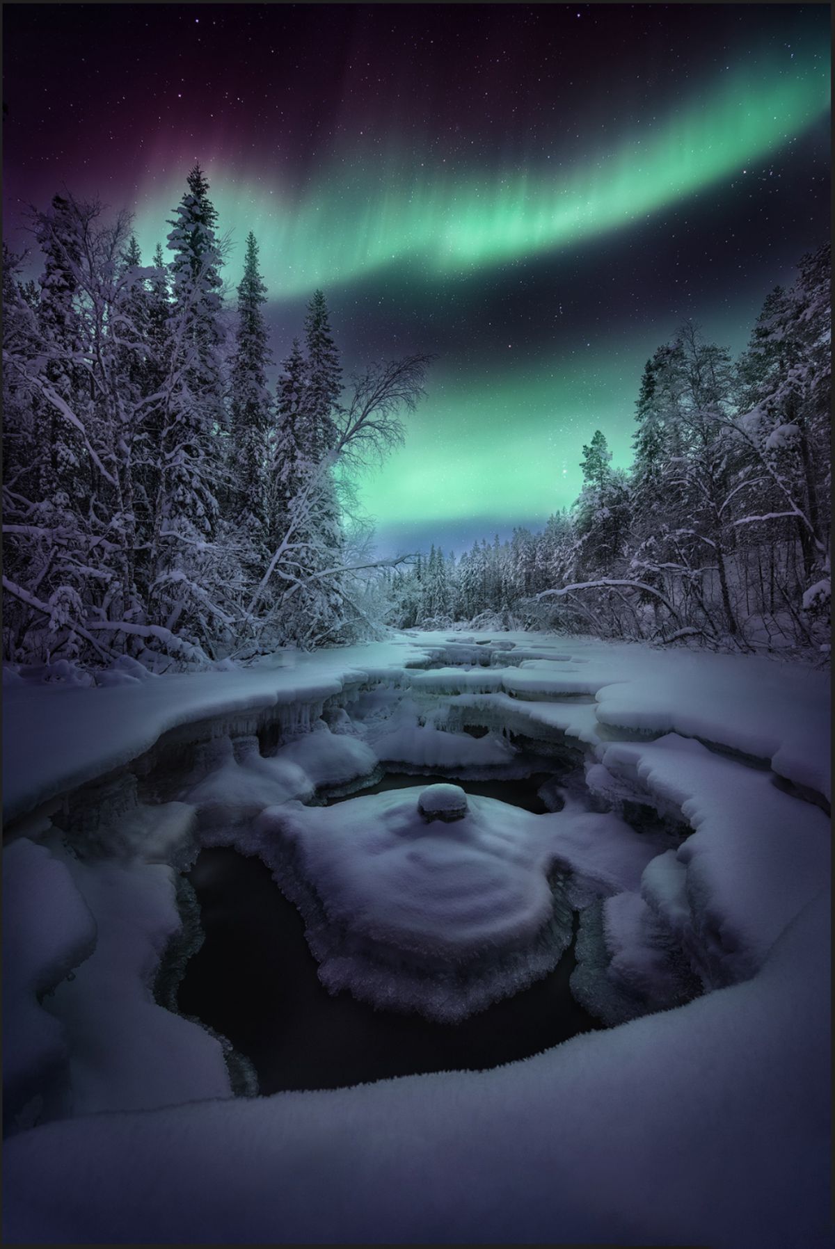 由于高纬度冬季白昼极短,这里一整天都是低角度阳光,拍完日出不久,随即拍摄日落,而漫漫长夜又是极光的天下。白海地区海岸线,登山顶以雪树掛为前景,拍摄极光