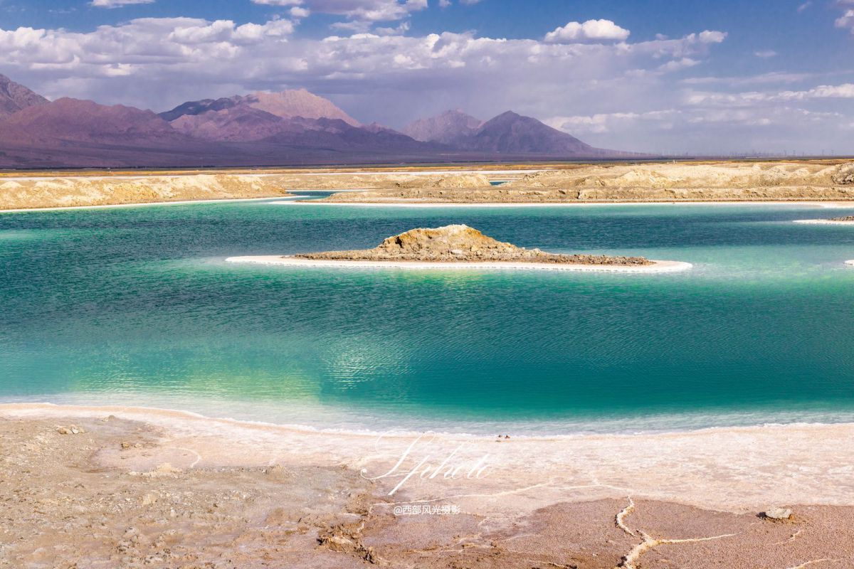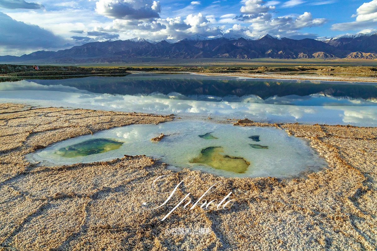 7.“翡翠湖”名为大柴旦湖,是原大柴旦化工厂盐湖采矿队采矿区,经多年开采形成采坑,变成了如今美丽的“翡翠湖”。站在湖边,宛若镜面般的湖面倒影着蓝天白云和皑皑雪峰,宛如仙境。